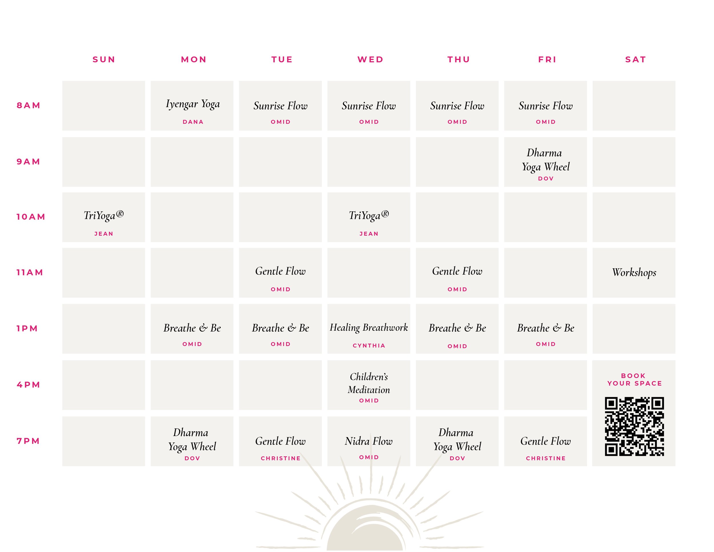 Find our regular weekly schedule below. In addition to the regular classes, we offer unique workshops on yoga philosophy, breathwork, postures, and meditation. We also host a book circle each season. Book a class, join a workshop or explore a book with us.